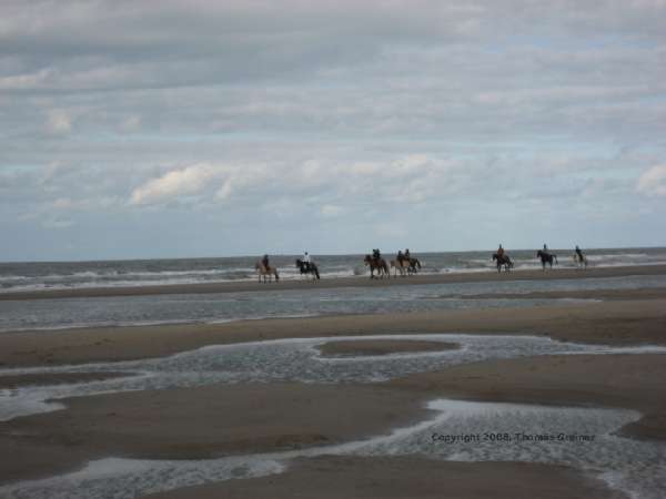 Auf dem Weg zurück, begegnen wir noch einer Gruppe Reiter. Soweit nach vorne ans Wasser gehen wir jetzt nicht mehr, das Wasser steigt schon wieder.