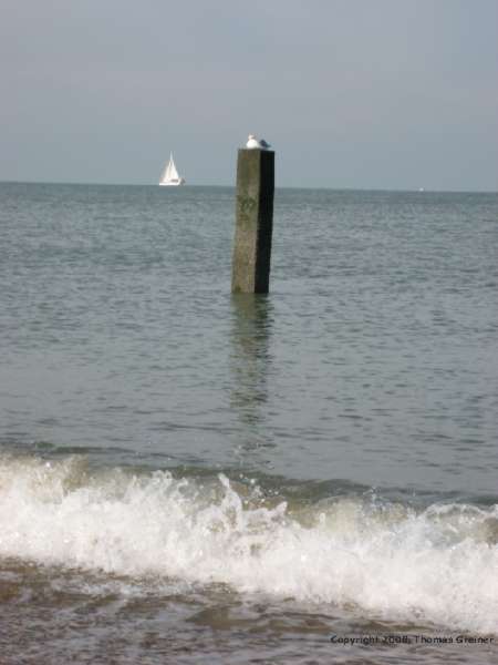Wieder zurück am Strand, dann noch einen letzten Blick auf das Segelschiff erhaschen, die Möwe ist davon sichtlich unbeeindruckt, sowohl vom Schiff als auch von uns.