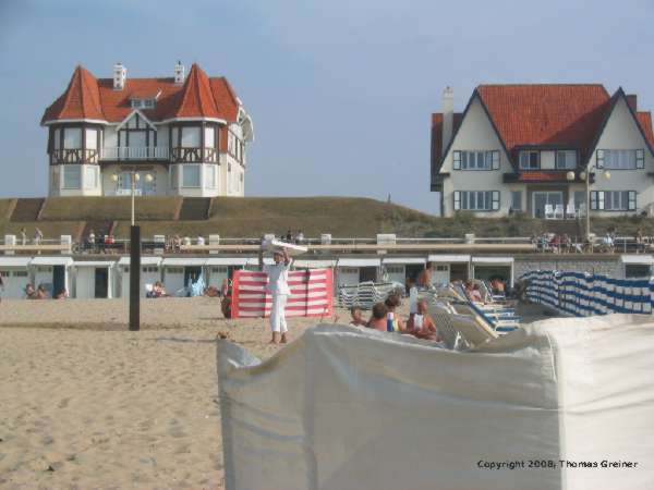 Am Strand hinter uns werden zwischen den verschiedenen mietbaren Liegemöglichkeiten diverse Leckereien aus den angrenzenden Bäckereien angeboten. Im Hintergrund sind zwei der schon beschriebenen historischen Villen zu sehen. In diesem Moment, fühle ich mich fast um hundert Jahre zurückversetzt.