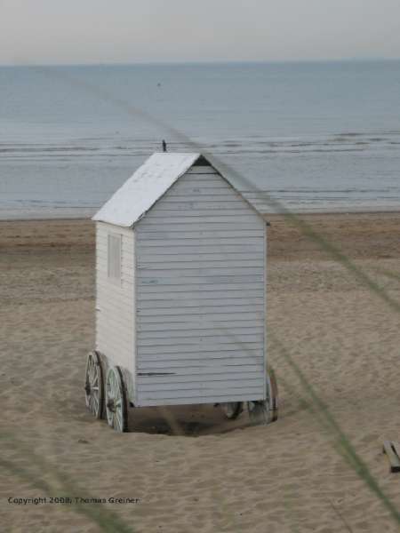 Nun wollen wir aber doch gleich noch die Umgebung erkunden. Direkt am Strand, Richtung Dünen, stoßen wir auf einen der schönen alten Badewagen. Man kann sich richtig vorstellen, wie hier früher gebadet wurde.