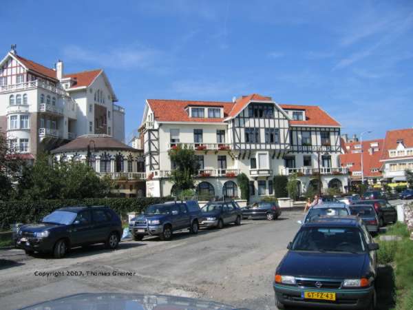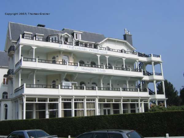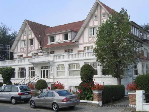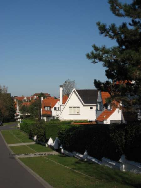 Im Jahre 1922 wurde das Hotel in eine Klinik umgewandelt. Heute dient es als Erholungsheim, auf dem oberen Balkongeländer steht "Onafhankelijke Ziekensfondsen". Oben sehen wir die typisch übereinander angebrachten Terrassen mit Art Deco Säulen und Balkongeländern, sowie der großen Freitreppe. Hier endet der Rundweg, da wir hier schon vorher mal waren, sollten Sie jetzt alleine zur Straßenbahn zurückfinden. Ich hoffe, ich konnte Ihnen ein paar Eindrücke vermitteln, spazieren Sie doch einfach mal selber durch De Haan und genießen Sie die schöne Architektur. Oder gehen Sie einfach mal hier zum Strand. |