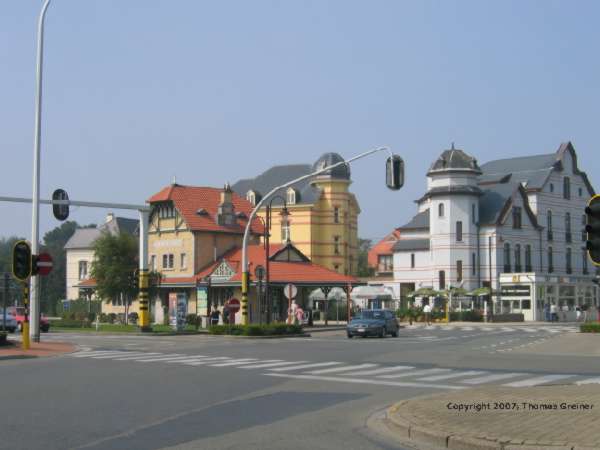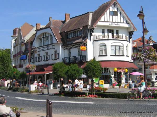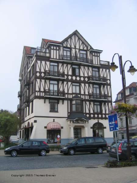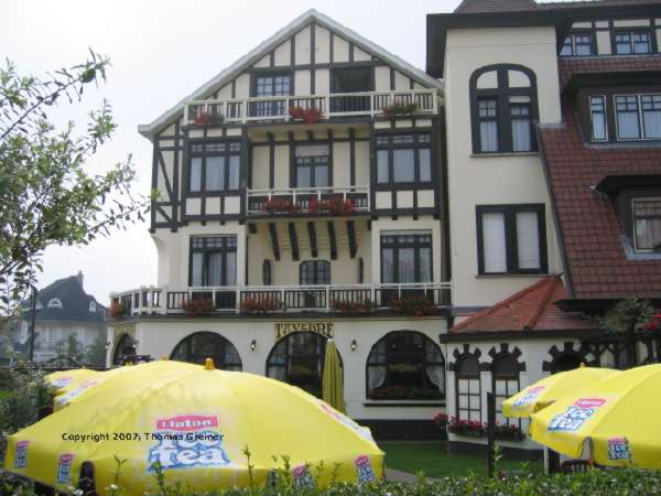 Hinter dem linken Kiosk liegt das oben gezeigte Chantecler. Auch dieses Gebäude aus den zwanziger Jahren ist in dem typischen normannisch angehauchten Stil, mit Pseudofachwerk und abgewölbtem Satteldach entstanden. Auch hier finden wir wieder ein umläufiges durchgehendes Schirmdach und die typischen krönenden Balkone an der Längsseite. Neben dem Chantecler liegt das zwei Jahre jüngere Belle Epoque Hotel.