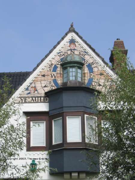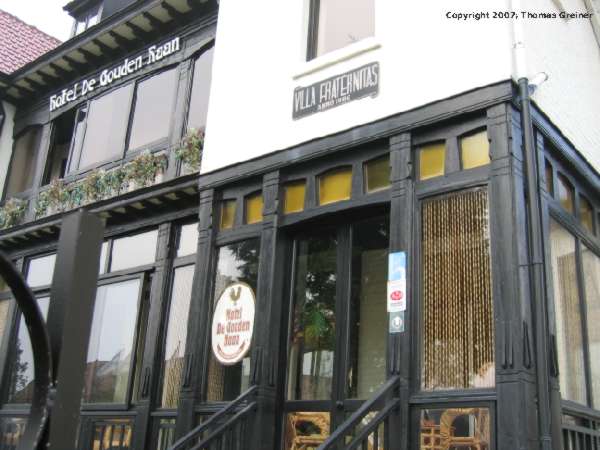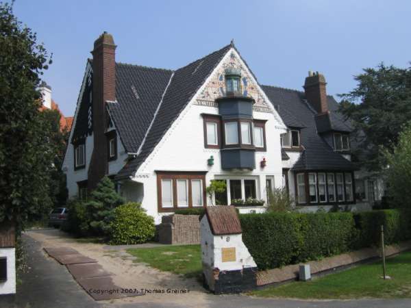 Wir folgen der Murillolaan und sehen gleich auf der rechten Seite die Hausnummer eins, das "Hotel De Gouden Haan". Das Hinweisschild über dem Eingang weist das Gebäude als "Villa Fraternitas" aus dem Jahre 1906 aus. Auch hier sind an den Holzkonstruktionen, auf denen der überdachte Balkon ruht, die Art Deco Einflüsse deutlich zu erkennen.