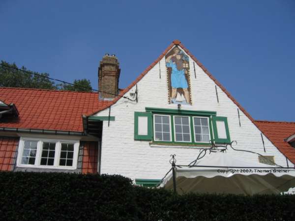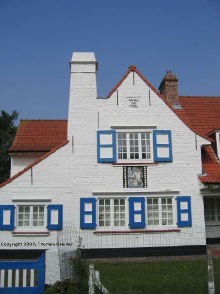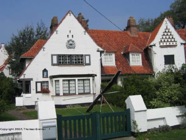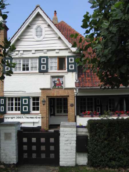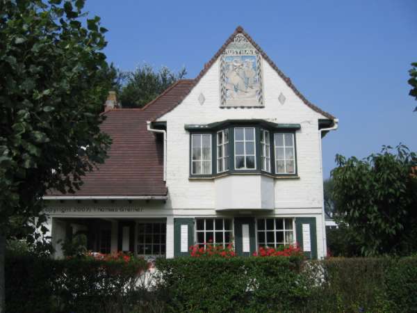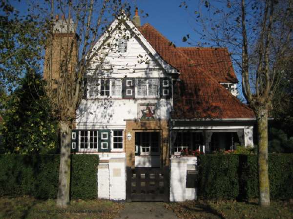 Nun folgen wir rechts der Rembrandtlaan. Hier befinden sich einige besonders hübsche, kleine Villen, die von dem Genter Architekten Valentin Vaerwyck zwischen 1925 und 1927 entworfen wurden. Diese Villen, gebaut nach dem flämischen Konzept im ländlichen Stil, sind mit weiß angestrichenen Ziegeln errichtet worden, mit tief geneigten Dächern, den Fensterflügeln und den mächtigen Schornsteinen. Die Namen sind mit teilweise sehr schönen Abbildern auf der Fassade verewigt worden. Untenstehend werden ohne weitere Beschreibung einige dieser Villen entlang der Rembrandtlaan gezeigt.