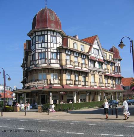 [Das Grand Hotel Belle Vue] Dieses am Königlichen Platz gelegene beeindruckende Gebäude wurde zwischen 1912 und 1920 fertig gestellt. Das dreieckige Gebäude besitzt an jeder Ecke einen Turm mit pagodenartiger Kuppel. Von durchgehenden Schirmdächern mit darüber angeordneten Balkonen umgeben, wird das Gebäude durch seine Spitzgiebel und das Pseudofachwerk geprägt, beides Ausdruck des normannischen Einflusses.