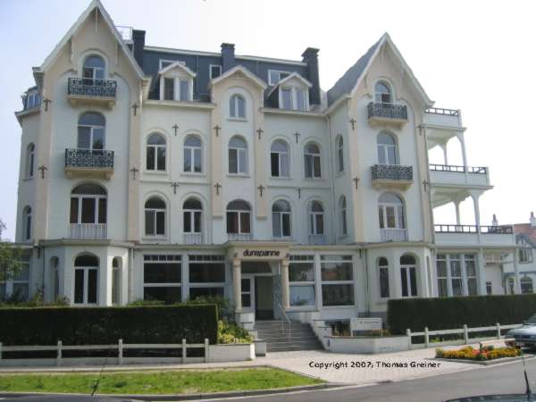 Zurück an der Maria Hendrikalaan, an den ehemaligen Tennisplätzen, biegen wir nach links ab und gelangen dann auf der linken Seite zum "Dunepanne". Einst war dieses Gebäude das "Hotel de Familles", eines der ersten Hotels der großen Konzession in dem unter anderem König Leopold II. im Jahre 1901 wohnte. Das symmetrische Gebäude mit zentralem Eingang wird von auskragenden Spitzgiebeln mit einem dreiteiligen vertieften Feld im Mauerwerk umgeben.