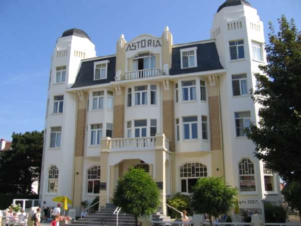 Weiter die Leopoldlaan entlang Richtung Strand auf der rechten Seite liegt das Astoria. Das vom Architekten Leon Ide im Art Deco Stil entworfene und von dem Bauunternehmer Beirens gegen Ende der zwanziger Jahre gebaute Gebäude ist durchaus erwähnenswert. Die polygonalen Ecktürme und der zentral über das Dach herausragende Namenszug stechen besonders ins Auge. Der Eingang wird durch die zwei Balkone und die imposante Treppe hervorgehoben. Wir folgen der Leopoldlaan weiter zu den ehemaligen Tennisplätzen. Dieser Platz, die zentrale Achse, um die der Straßenplan angelegt wurde, heißt im Volksmund auch "La Potinière", das Schwatzmaul! Woher diese Bezeichnung stammen könnte, mag sich jeder selber ausmalen.
